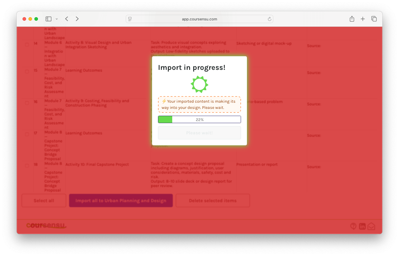 Outcome: You have completed this task 🚀 Nice one. You have imported design content and can now use Coursensu to make your future design decisions for this work.